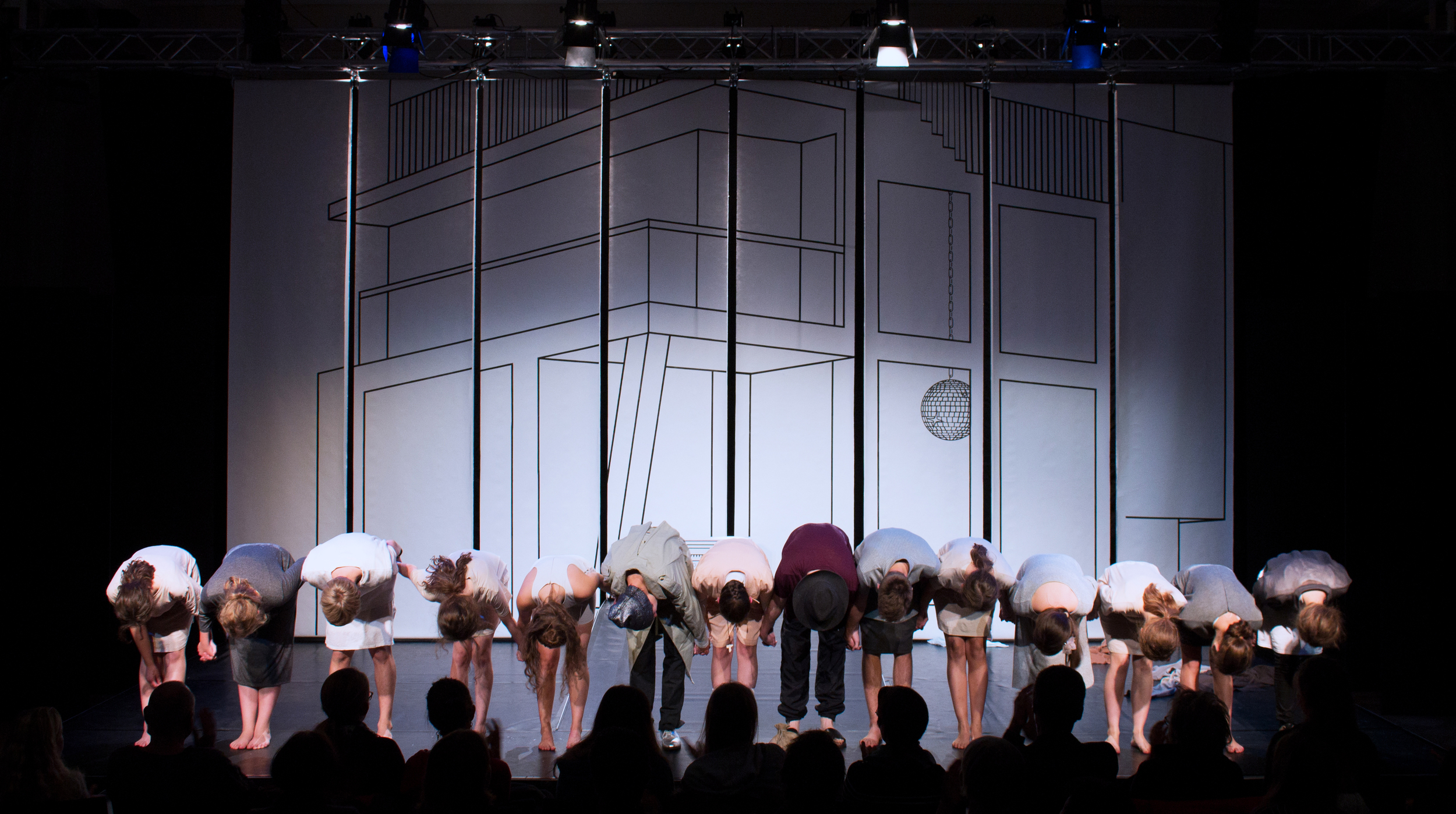 Stage design for the rarely performed play by Ödön von Horáth – The play takes place in the ancient city of Pompeji in 78 AD. A banker leaves his house and slaves behind to spend the summer in Kreta. During his absence things get out of control. Power and impotence as well as past and present start to blur which is being reflected in the stage design. The eight panels that at first show the mansion in a graphical way, are moved by the slaves and change into a surreal picture.In the end the slaves celebrate the sinking of their masters ship and their new freedom in front of the modern villa that is now visible on the eight panels of the stage design.
